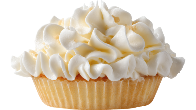 Delightful vanilla cupcake topped with fluffy frosting and colorful sprinkles on a white background isolated on transparent background