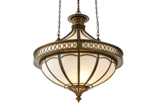 Ornate Moroccan Style Hanging Lantern with Frosted Glass Panels and Warm Light, isolated on a transparent background, cutout, PNG