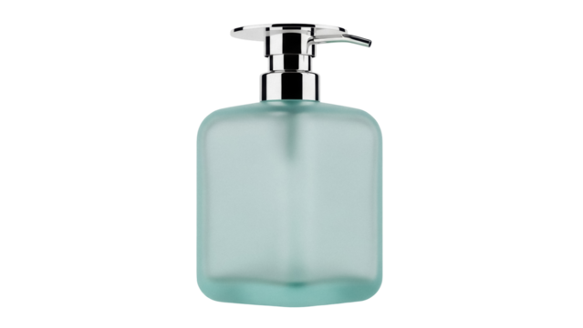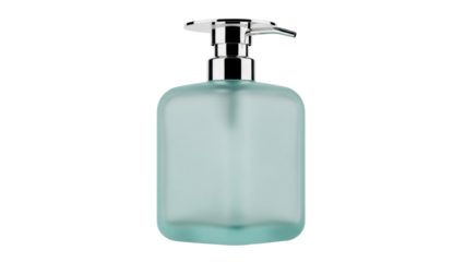 Elegant frosted glass soap dispenser isolated PNG, refillable container with chrome pump for bathroom or kitchen on transparent background