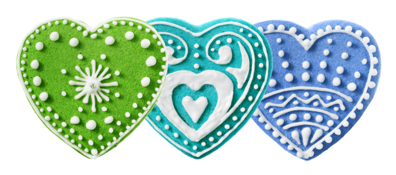 three heart-shaped cookies decorated with colorful icing in green, turquoise, and blue, adorned with intricate white patterns and dots.