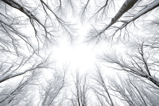 Winter forest scene from below, showing bare tree branches stretching upwards isolated on white background