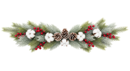 Isolated arrangement of frosted Christmas pine garland with red berries and cotton blossoms