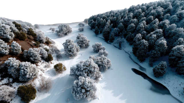 A snowy hillside with trees and a white background