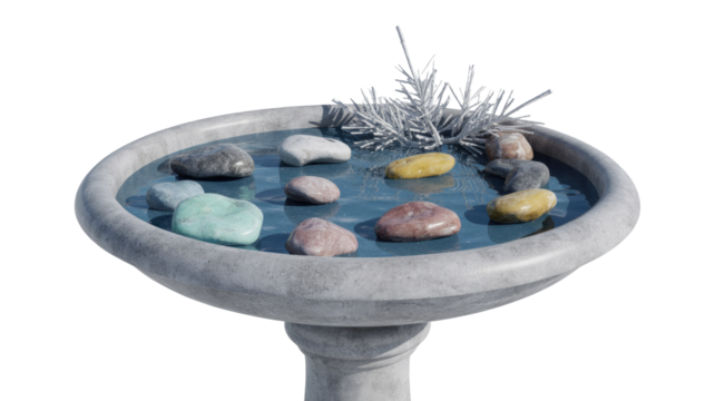 A concrete bird bath filled with tranquil blue water, featuring an array of colorful floating stones and a frosty white plant. Serene natural decor. background removed