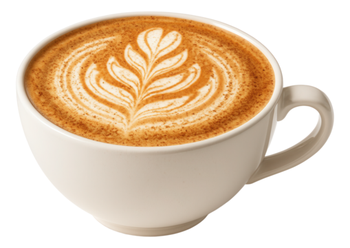 A delicious cup of coffee with latte art and coffee beans, isolated on transparent background
