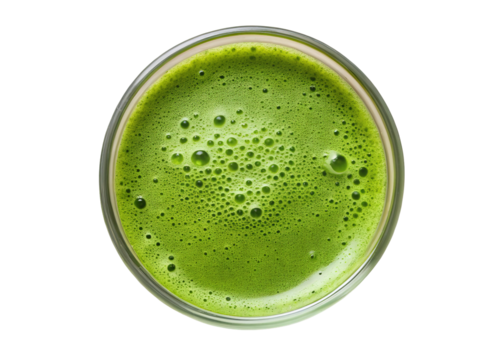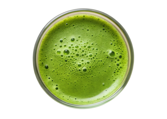 A vibrant overhead view of a frothy green beverage on transparent background