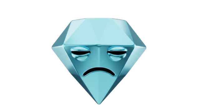Sad diamond cartoon character isolated PNG, blue gem with a frowning face on transparent background, unhappy precious stone