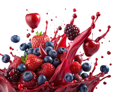 Fresh fruit explosion with strawberries, blueberries, raspberries, cherries, blackberries splashing in red berry juice with water droplets, isolated on a transparent background