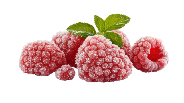 Six raspberries, some covered with sugar and frost, arranged in rows on transparent background