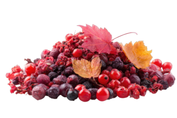 Frozen mixed berries with a fine icy coating, spread in a plastic tray.