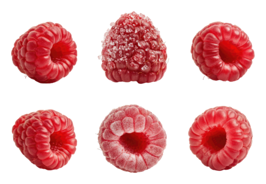 Six raspberries, some covered with sugar and frost, arranged in rows on transparent background