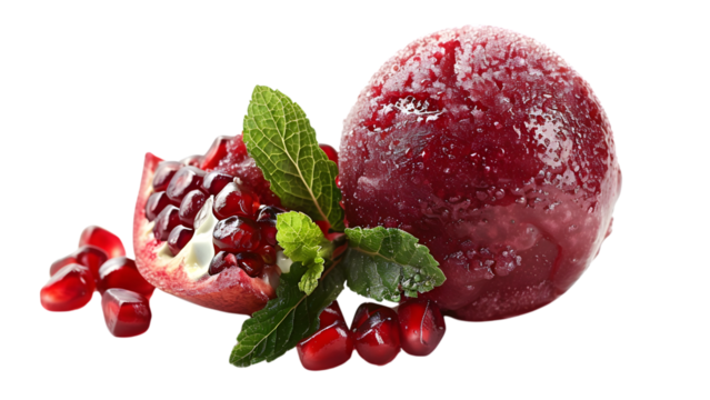Red pomegranate ice cream scoop with fresh halved fruit and green leaves, juicy seeds scattered on a transparent background