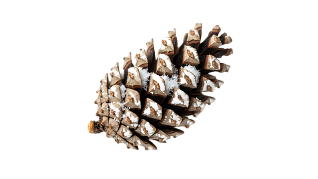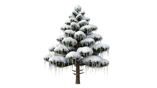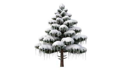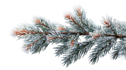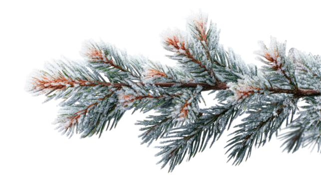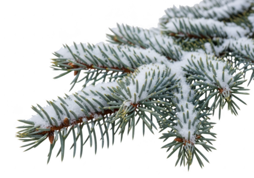 Macro view of pine branch with thick snow buildup isolated on transparent background