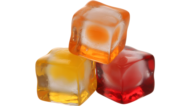 Vibrant trio of colorful ice cubes, perfect for refreshing beverage advertising and summer themes