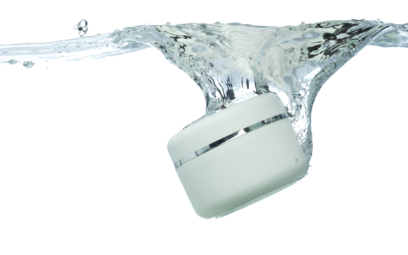Red Cosmetic container fall into clear water with air bubble. Cosmetic treatment container drop to clear water of freshness. White background isolated freeze element