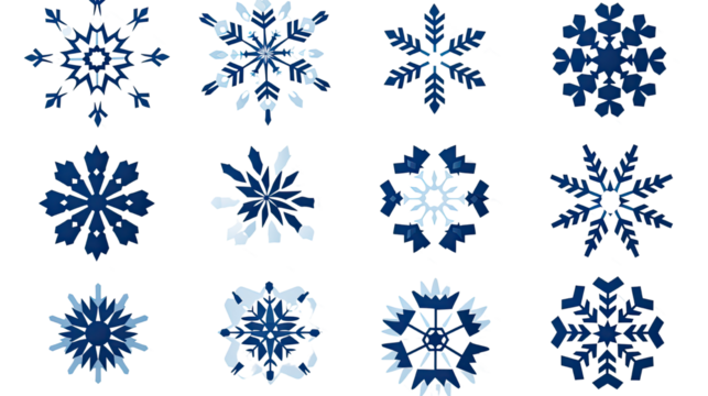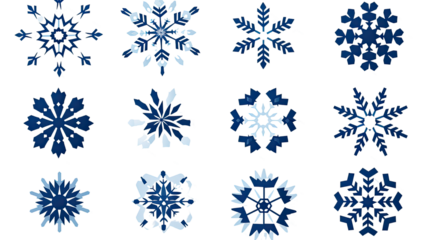 Set of twelve decorative blue snowflakes winter shapes cut paper craft design isolated on white background