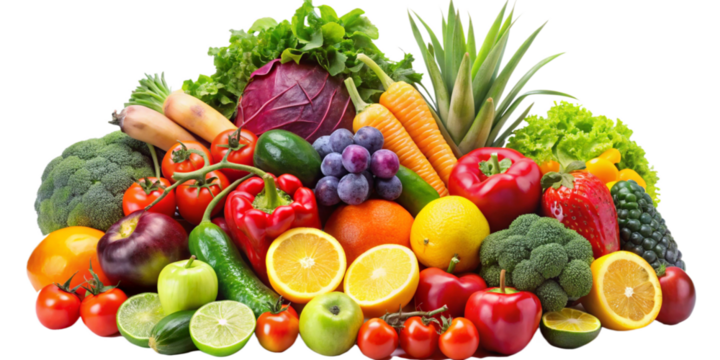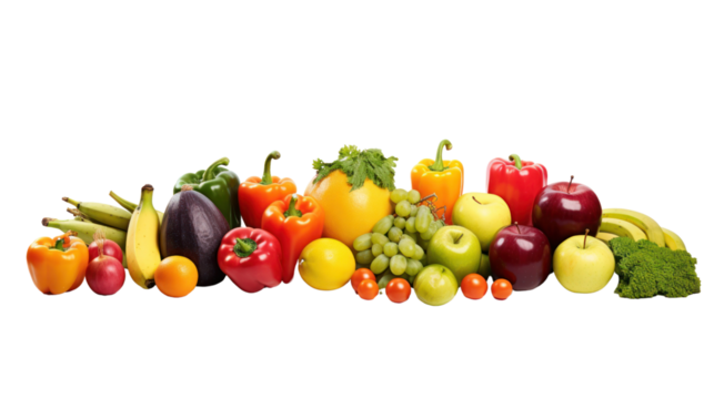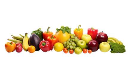 fresh colorful assortment of fruits and vegetables isolated on white or transparent png
