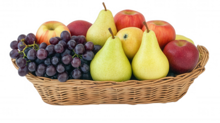 Fresh fruit basket filled with apples, pears, and grapes, transparent background