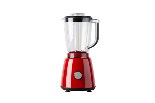 Stylish red blender with black lid, clear pitcher, and sturdy base, isolated on a transparent background