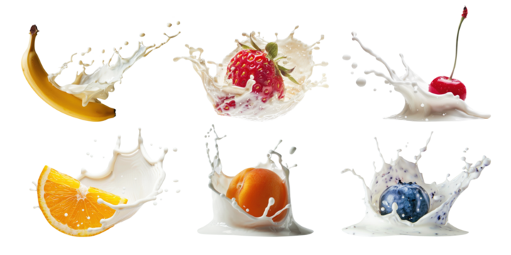 Two colorful fruit juices splashing together with fruit slices isolated on transparent background