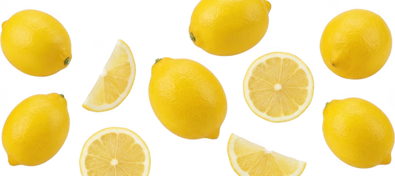 Assortment of bright yellow lemons and lemon slices artfully arranged in a dynamic scattered composition against a neutral background 189 characters citrus fruit food fresh juicy vitamin C