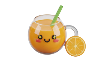 Isolated orange juice in mug with smiley face, drink illustration, side view, citrus fruit