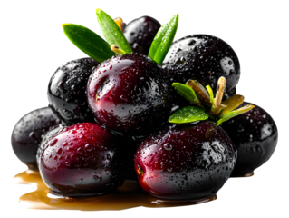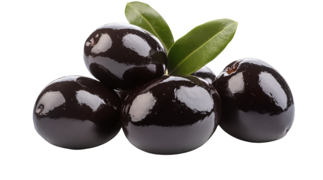 Cluster of glossy black olives, some with leaves, isolated on transparent background --ar 4:3 --v 7.0 --p 537mr6h --s 250