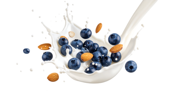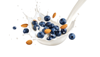 Fresh blueberries and almonds splashing in creamy milk splash