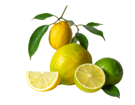 Fresh lemons showing juicy half and whole fruit on transparent background