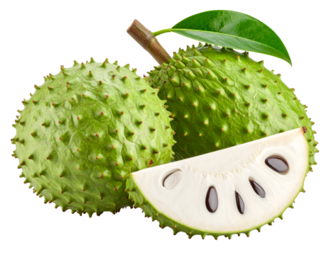 Green fruit with spikes and a sliced section revealing seeds. Transparent background