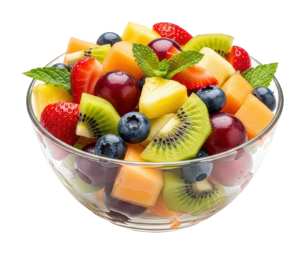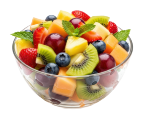 Vibrant fruits and vegetables arranged in large blue note bowl on transparent background