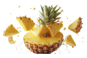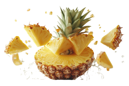 Fresh pineapple slices in mid-air demonstrate vibrant colors and freshness from tropical fruit display
