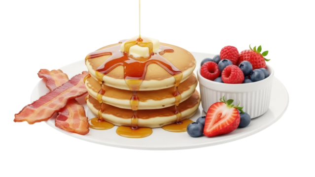 Stack of pancakes with butter and maple syrup isolated PNG, served with bacon and fresh berries on transparent background