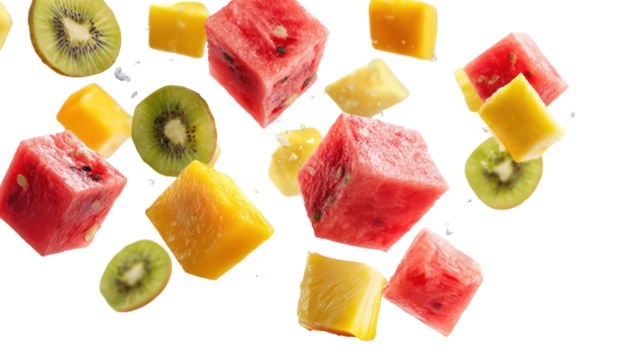 Assortment of fresh chopped fruits falling isolated on transparent background