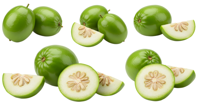 Fresh green guava fruit whole and sliced with white background, healthy tropical fruit perfect for smoothies and cooking