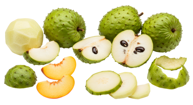 Soursop tropical fruit fresh whole and sliced with white background, healthy exotic fruit perfect for smoothies and juices