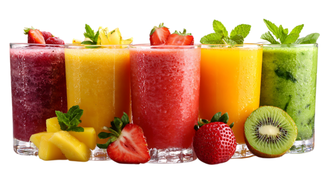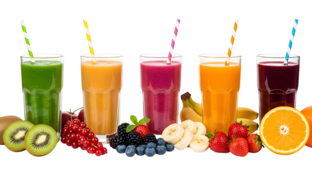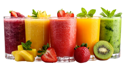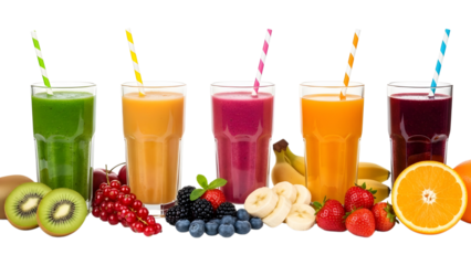 Assortment of colorful fruit smoothies and ingredients isolated on transparent background
