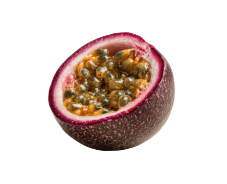 A halved passion fruit, seeds visible
