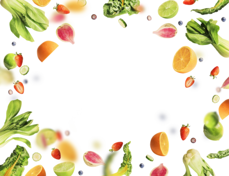 Frame of various flying or falling summer fruits, berries and vegetables on transparent background. Healthy food. Detox and dieting concept