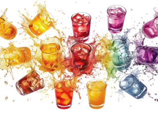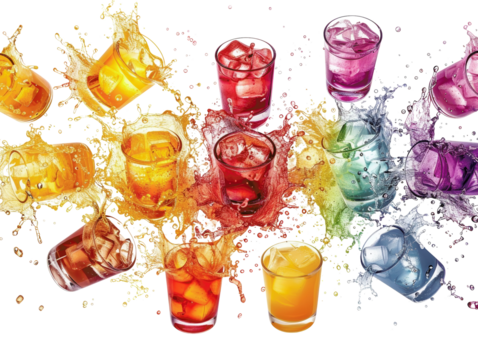 Vibrant splashes of colorful cocktails in glasses with ice cubes. Refreshing and fruity beverages perfect for parties and celebrations.
