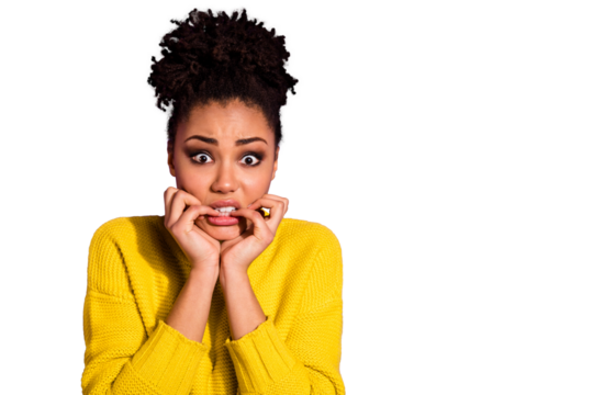 Portrait of terrified beautiful youth nails bite hear horrible news wear stylish trendy pullover jumper isolated over purple violet background