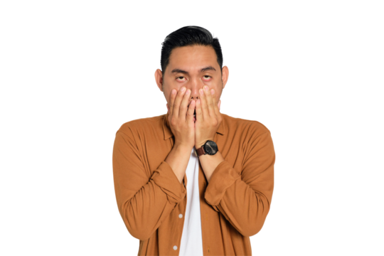 Tired young Asian man in casual shirt rubbing his face down with hand isolated on transparent background