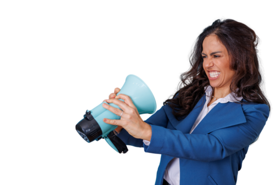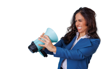 Businesswoman loudly speaking into megaphone, her face showing frustration while making an announcement, transparent background