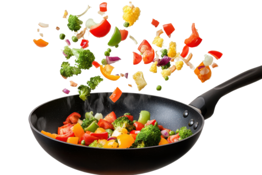 Flying Chicken and Vegetable Stir fry, into a frying pan isolated on a transparent background