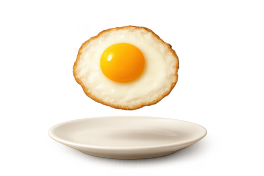 Perfectly fried sunny side up egg floating above white plate, transparent background