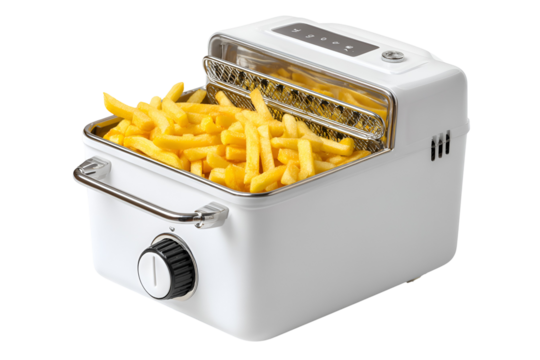 White electric air fryer filled with golden french fries isolated on transparent background