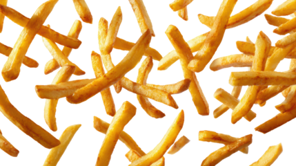Crispy golden French fries scattered on a white background.