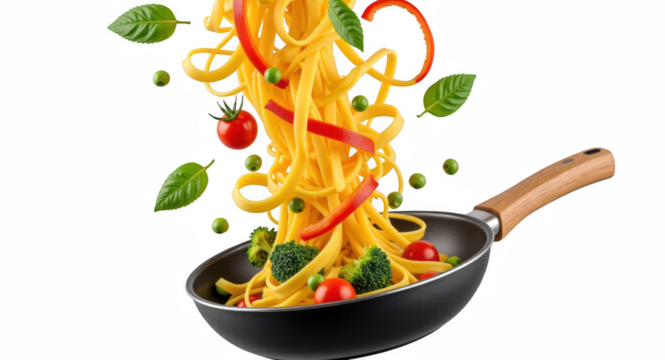 Colorful Vegetables and Fresh Pasta Being Sautéed in a Pan with a Transparent Background