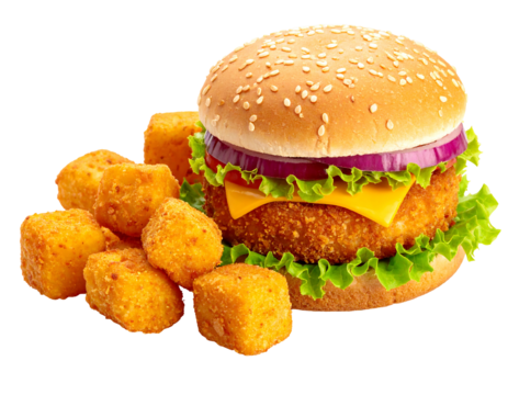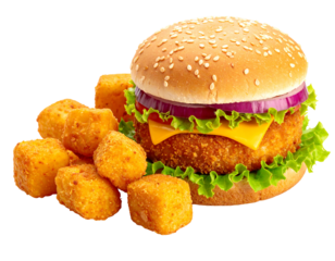 A close-up shot of a burger with a golden-brown patty, cheese, and vegetables on a sesame bun, with fried square sides