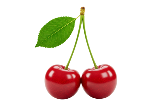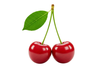 透明背景に分離された二つの熟した赤いサクランボと緑の葉のクローズアップビュー